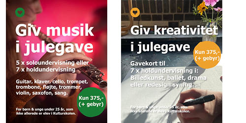 Årets bedste julegaveidé med indhold er et gavekort til undervisning i Kulturskolen til en rigtig god julepris! Med gavekortet kan børn og unge få en smagsprøve på undervisning i et instrument, sang eller et af vores kreative fag. Det koster 375 kr. og det kan indløses i hele 2026. Tilbuddet gælder kun børn/unge under 25 år, som ikke allerede er tilmeldt faget/holdet.